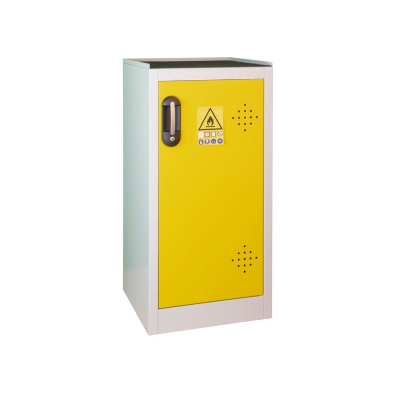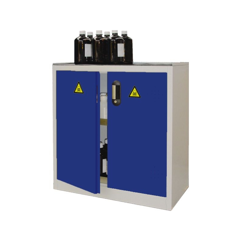 En acier monobloc avec portes battantes à 110°. Solution économique pour le stockage de produits dangereux en toute sécurité et en conformité avec la législation. Fournie avec pictogrammes normalisés : Corrosifs , Toxiques et Inflammables (à apposer selon utilisation). Orifices de ventilation haut et bas au niveau des portes. Fermeture à clé en 3 points. Étagères et bacs de rétention réglables en hauteur sur crémaillères, au pas de 15 mm. Armoire haute à 4 étagères ou basse à 2 étagères. Plan de travail des armoires comptoirs recouvert par un tapis en caoutchouc. Conformes aux articles R5132-66 et R5132-68 du Code de la Santé Publique. Conformes aux recommandations de l'INRS. Charge admissible par étagère : 80 kg UR Coloris : corps gris et portes jaunes Existe avec portes rouges, bleues et vertes, nous consulter.