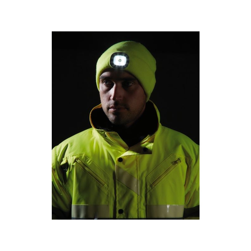 Tricot 100% acrylique. Lumière LED amovible et rechargeable par USB. Autonomie 2 à 4h Puissance : 150 Lm Coloris : bleu marine, noir, jaune, orange Taille : unique