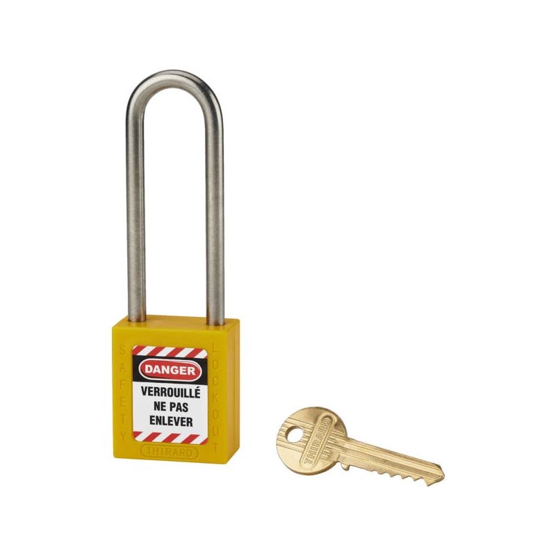 Corps ABS non conducteur avec anse en acier inoxydable. Double ancrage. Fonction clé prisonnière. Livré avec 1 clé. Fonction clé prisonnière. Environnement ATEX. Dimensions corps (L x H) : 38 x 44 mm