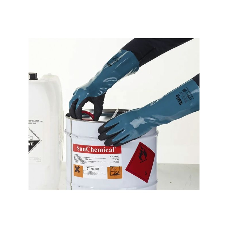 Enduction double couche bipolymère : - 1ère enduction nitrile sur toute la main : cette première enduction nitrile étanchéifie le gant. - 2ème enduction PU base aqueuse : Cette deuxième enduction PU avec technologie T-Touch® sur la paume et le pouce renforce la résistance à l'abrasion. Le nitrile associé au polyuréthane base aqueuse donne une bonne protection en conditions sèches, humides ou légèrement huileuses. Support tricoté nylon. Contact alimentaire. Environnement : chimique, huileux, humide, sec Applications métiers : industrie aérospatiale, services d'urgence, manipulation de produits chimiques particulièrement caustiques et dissolvants, raffineries et pétrole, maintenance Épaisseur : 0,80 mm (partie verte) - 1,20 mm (partie noire) Longueur : 35 cm Taille : 8 à 10 Norme : CE Cat III - EN 388 (4121X) - EN 374-1 type B (AJKL) - EN 374-5