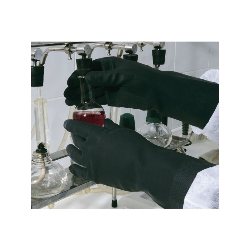 Néoprène. Finition paume et doigts nid d'abeille. Sans support, intérieur floqué à base de coton. Manchette droite. Environnement : chimique, huileux, humide, sec Applications métiers : industrie chimique, nettoyage industriel, plateformes pétrolières, raffinage, pétrochimie, travaux de forage, assainissement, pêche industrielle, sablage et grenaillage Épaisseur : 0,70 mm Longueur : 30 cm Taille : 6 (XS) à 11 (XXL) Norme : CE Cat III - EN 388 (3110X) - EN 374-1 type A (AKLMNOPST) - EN 374-5