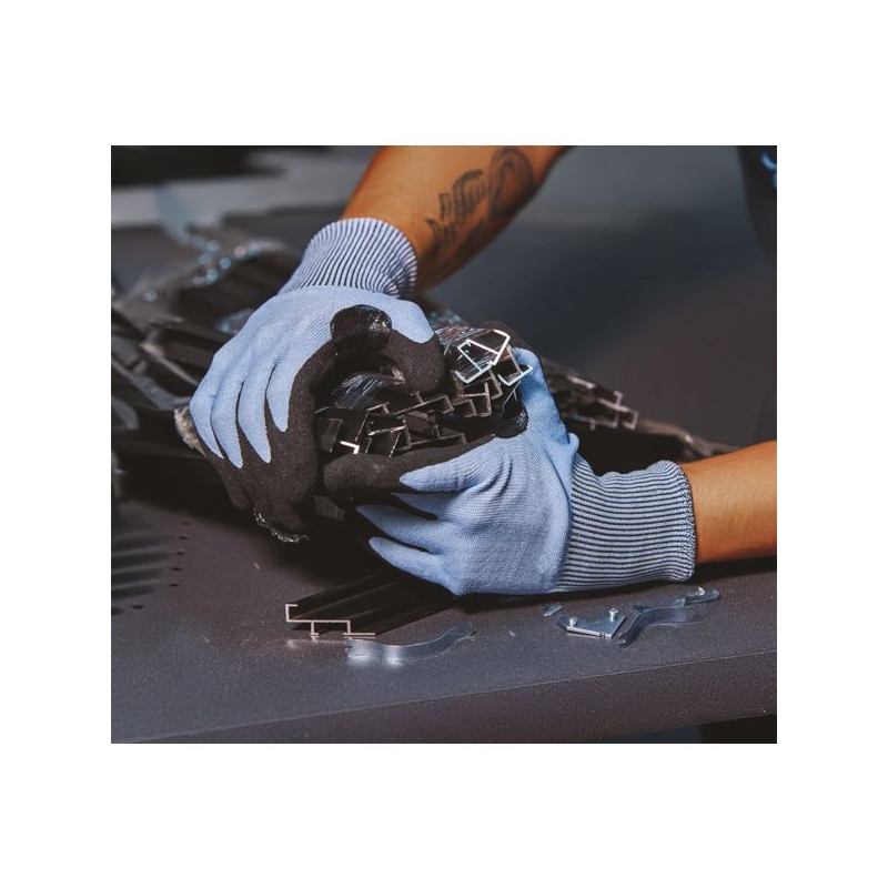Enduction nitrile mousse sur paume et bouts de doigts. Finition sablée, très bon Grip. Renfort entre le pouce et l'index. Support tricoté en fibres textile K-Rock® (fibre de verre, fil d'acier, nylon® et élasthanne), nouvelle technologie anticoupure, sans couture, jauge 13. Dos aéré, poignet tricot élastique. Écran tactile. Contact alimentaire. Environnement : humide, sec, huileux Applications métiers : pliage métallique, emboutissage, assemblage, fabrication de matrices et moules, usinage et ajustage, travaux avec des profils métalliques et feuillards, travaux de maintenance, industrie alimentaire Taille : 6 à 11 Norme : CE Cat II - EN 388 (4X42E) - EN 407 (X1XXXX)