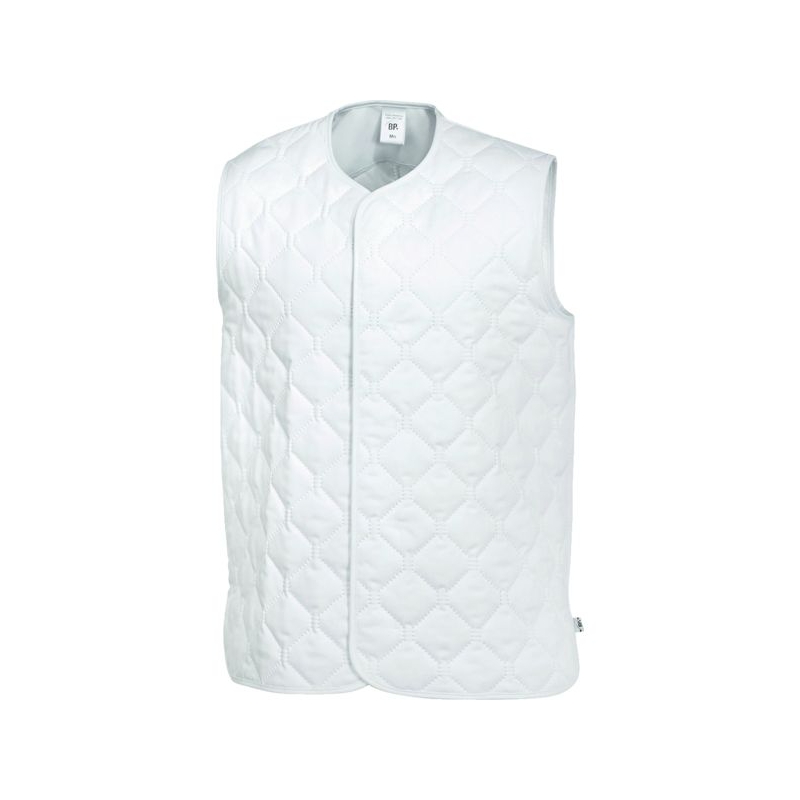 Extérieur : 67% polyester 33% coton, 200 g/m². Doublure matelassée : 100% polyester. Intérieur : 50% coton 50% polyester, 250 g/m². Développé selon l'HACCP, tissu thermique soudé à haute fréquence. Sans manches, encolure V, fermeture par boutons-pression dissimulés. Entretien : lavage industriel 15797 4B Longueur : 78 cm Coloris : blanc Taille : XS à 3XL Norme : CE Cat II - DIN 10524 - EN 15797