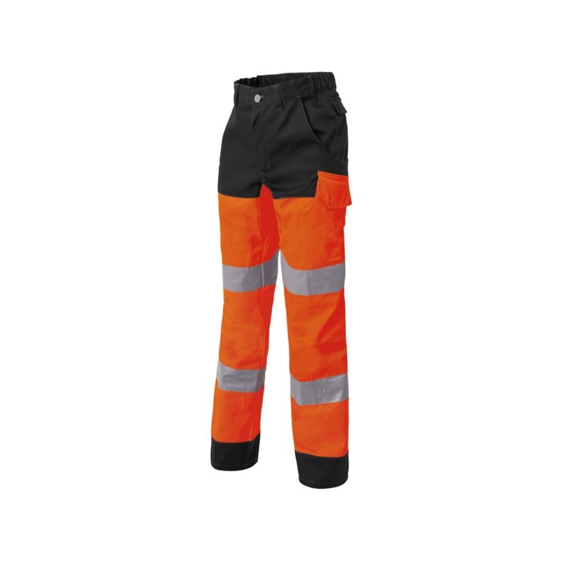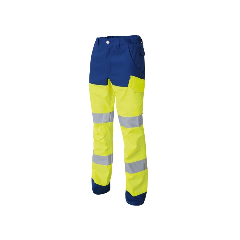 Tissu fluo : 60% coton 40% polyester - Satin, 300 g/m². Tissu contraste : 60% coton 40% polyester - Croisé, 300 g/m². Coupe baggy, taille semi-élastiquée, ceinture 5 passants, braguette à glissière. 2 poches italiennes, 1 poche téléphone fermée par rabat velcro, 1 poche arrière, 1 grande poche cuisse fermée par rabat velcro, 1 poche plaquée sur la cuisse droite, 1 poche mètre, 1 sangle porte outils. Empiècement d'aisance à l'entrejambe, genoux préformés. Bandes rétro réfléchissantes sur les jambes. Entretien : lavage ménager Entrejambe : 2 entrejambes disponibles : 78 cm ou 84 cm Coloris : jaune fluo/blade blue, jaune fluo/gris foncé, jaune fluo/marine, jaune fluo/vert, orange fluo/marine, orange fluo/gris, rouge fluo/gris foncé Taille : 36 à 60 Norme : CE Cat II - EN ISO 20471 (2)
