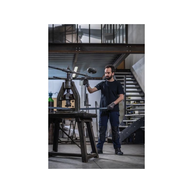 94% nylon 6% spandex, 260 gr/m2. Tissu de renfort 93% polyamide 7% polyester, 230 gr/m². Ceinture droite élastiquée côtés, avec braguette fermeture à glissière et bouton clou. Sangle et boucle D. 3 passants larges au dos. 2 poches italiennes, 2 poches revolver plaquées avec bas volants fermées par velcros, 2 poches cuisses dont la droite zippée et renforcée Cordura® avec surpoche à double compartiment (1 fermé par velcro et 1 avec sangle plaquée) Emplacements pour genouillères avec pinces et rabat + bandes rétro réfléchissantes, réf. 100483 (à commander séparément). Entrejambe avec triple surpiqûre. Panneau aisance à l'entrejambe, ourlet bas de jambe en Cordura®. Coloris : marine/noir, gris/noir, noir Taille : 36 à 60 Norme : CE Cat II - EN 14404 porté avec genouillères