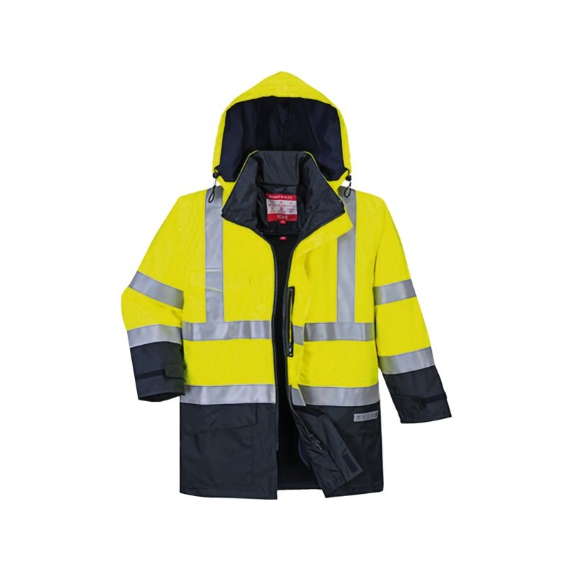 Extérieur : 98% polyester 2% fibre carbone, 250 g/m². Enduction PU, imperméable et respirant. Intérieur : 100% coton traité flamme retardant (FR), 170 g/m². Bandes rétroréfléchissantes traité flamme retardant (FR) : 2 torses, les bras et les épaules. Fermeture à glissière double curseur sous rabat velcro, 2 poches basses avec rabat de sécurité fermeture velcro, 1 poche intérieure, 1 poche téléphone. Capuche doublée, cachée sous col avec cordon de serrage. Doublure : gilet amovible en polaire 100% polyester traité flamme retardant (FR), 350 g/m². Entretien : lavage ménager Coloris : jaune fluo/marine, orange fluo/marine Taille : S à 3XL Norme : CE Cat II - EN ISO 20471 (3) - EN 343 (3.3) - EN ISO 14116 - EN 1149-5 - EN 13034 type 6- IEC 61482-2 classe 2