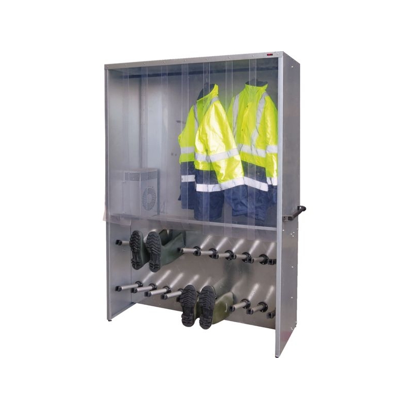 Penderie collective chauffante avec sèche-bottes. Utilisation très simple. Structure monobloc galvanisée avec rideaux en PVC translucide et système de ventilation d'air chaud. Permet de sécher simultanément vêtements de travail (penderie) et chaussures pour 10 personnes. Support gants en option. Puissance : 1,6 kW (ventilation + chauffage temporisés) Temporisation : 1 à 4 h L x H x P : 1550 x 1970 x 500 mm