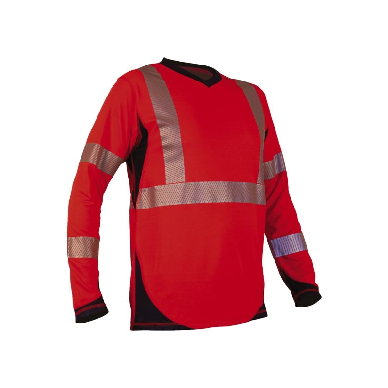 50% bambou 50% polyester cooldry – Maille Naturatex, 170 g/m². Fibre de Bambou ultra confortable contre la peau. Cette fibre végétale naturelle très hydrophobe permet un excellent transfert d’humidité sur la face polyester cooldry qui sèche très rapidement à l’air. Comme toute fibre naturelle, elle est naturellement bactériostatique et évite donc la prolifération des mauvaises odeurs. Bandes rétroréfléchissantes segmentées - respirantes, extensibles et légères (50 cycles de lavage). La segmentation de la bande permet l’évacuation de la transpiration et optimise le confort par forte chaleur. Col V, coutures plates anti-irritations, bas de manches et base sur les côtés en tissu maille technique ultra respirant en coloris contrastant. Manches longues. Entretien : lavage ménager (certifié 50 lavages) Protection contre les rayons UV : UPF 40+ Coloris : jaune fluo/marine, orange fluo/marine, rouge fluo/noir Taille : S à 3XL Norme : CE Cat II - EN ISO 20471 (2) - EN 13758-2