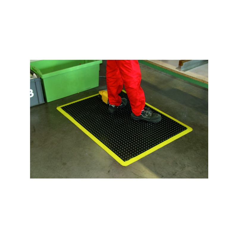 Tapis antifatigue antidérapant en caoutchouc naturel noir et nitrile. Utilisation en milieu sec ou légèrement humide ou huileux, pour chaîne de production, postes fixes en milieu industriel ou commercial. Bords jaunes biseautés pour éviter les risques de chute. Résistant, isole du froid, réduit le bruit et la casse. Très bonne résistance à l'abrasion. Améliore les conditions de travail et la productivité des personnes en station debout. Épaisseur : 16 mm Existe en rouleau.
