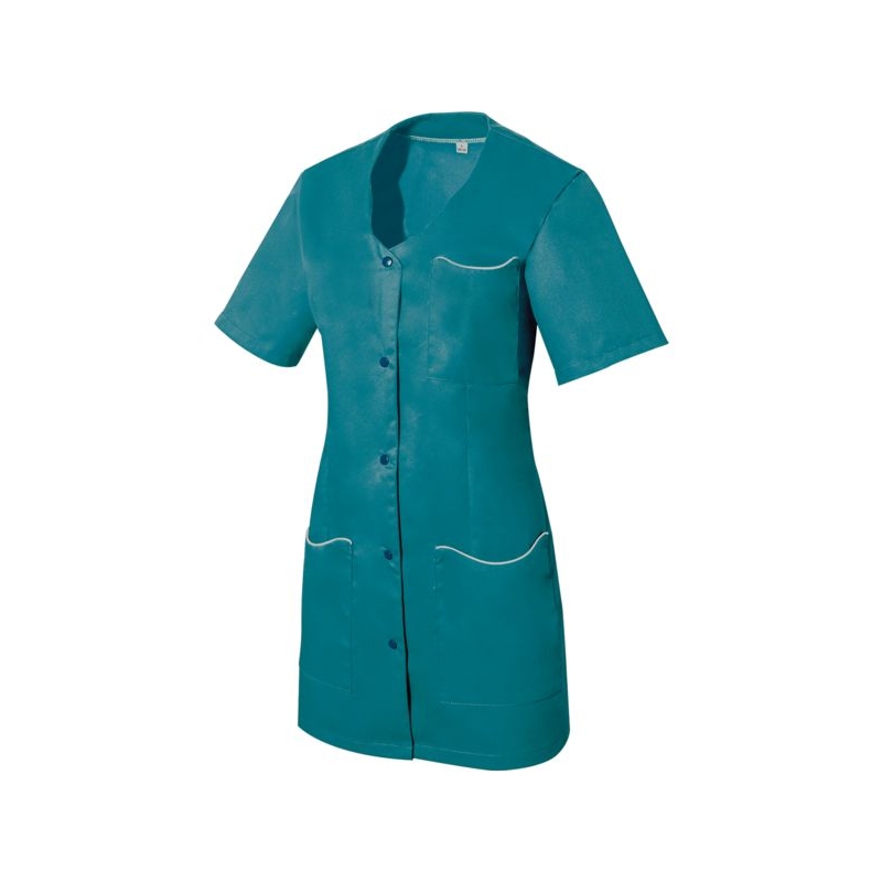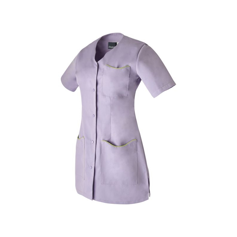 65% polyester 35% coton, 210 g/m². Sans col, fentes côtés, fermeture centrale par 5 pressions. 1 poche poitrine, 2 poches basses plaquées. Longueur : 80 cm Coloris : blanc, gris perle, parme, rose, vert anis Taille : 0 à 6 Norme : CE Cat II - EN 15797