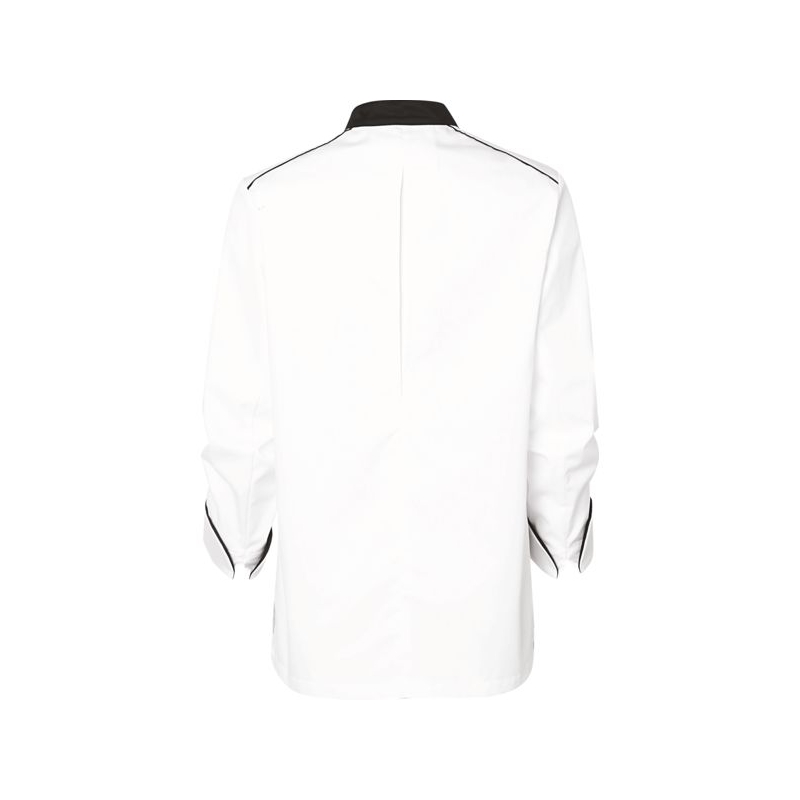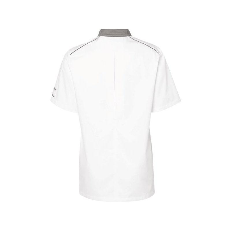 65 % polyester 35 % coton - Sergé 195 g/m², Maille respirante alvéolée double face antibactérien 100% polyester, 160 g/m². Col officier et liseré contrastés. Fentes côtés. Fermeture asymétrique par pressions non apparentes. 1 poche poitrine côté gauche. 1 poche stylo sur manche gauche. Soufflet dos et empiècement aisselle en maille respirante antibactérienne. Coloris manches longues : blanc/gris, blanc/noir, blanc/blanc, blanc/denim Coloris manches courtes : blanc/noir, blanc/gris Taille : 00 à 6