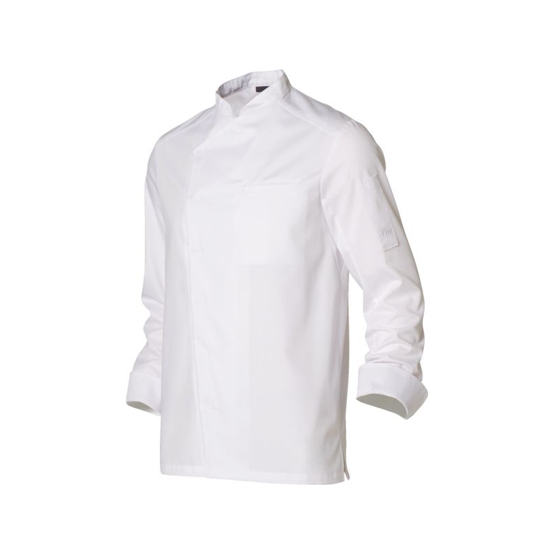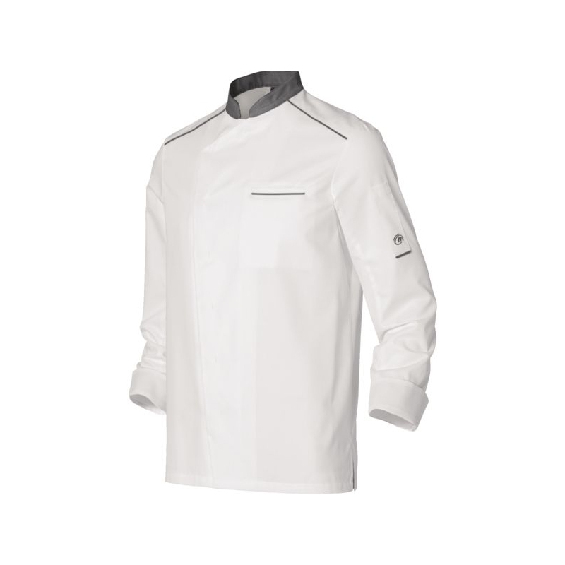 65 % polyester 35 % coton - Sergé 195 g/m², Maille respirante alvéolée double face antibactérien 100% polyester, 160 g/m². Col officier et liseré contrastés. Fentes côtés. Fermeture asymétrique par pressions non apparentes. 1 poche poitrine côté gauche. 1 poche stylo sur manche gauche. Soufflet dos et empiècement aisselle en maille respirante antibactérienne. Coloris manches longues : blanc/gris, blanc/noir, blanc/blanc, blanc/denim Coloris manches courtes : blanc/noir, blanc/gris Taille : 00 à 6