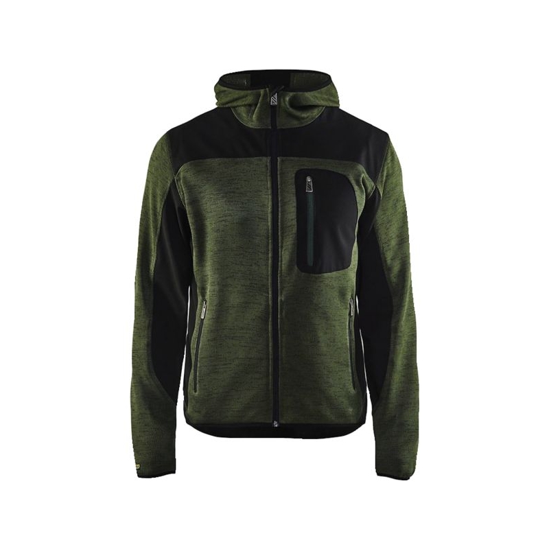 Bimatière : tricoté 100% polyester, 380 g/m². Softshell 3 couches (94% polyester 6% élasthanne enduit TPU) + 100% polyester polaire, 330 g/m². Softshell doublé polaire sur les épaules, les côtés et les bras. Fermeture à glissière jusqu’en haut du col et multipoches. Capuche fixe et dos relevé. Coloris : jaune fluo/noir, vert armée/noir, orange fluo/noir, marine foncé/jaune, marine foncé/noir, marine/marine, gris chiné/noir, bleu/noir, gris anthracite/noir Taille : XS à 4XL