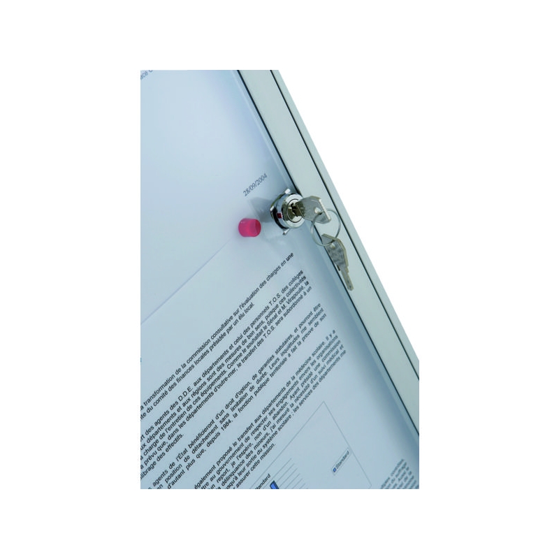 Porte battante, fermeture par serrure à clé avec pose à droite. Profil alu anodisé naturel, façade plexiglass avec entourage à partir du formats 6 feuilles. Fond tôle blanc pour affichage magnétique. Fixation murale 4 points. Absence d'entourage de porte pour le format 4 feuilles. Épaisseur hors-tout : 20 mm Épaisseur utile : 12 mm